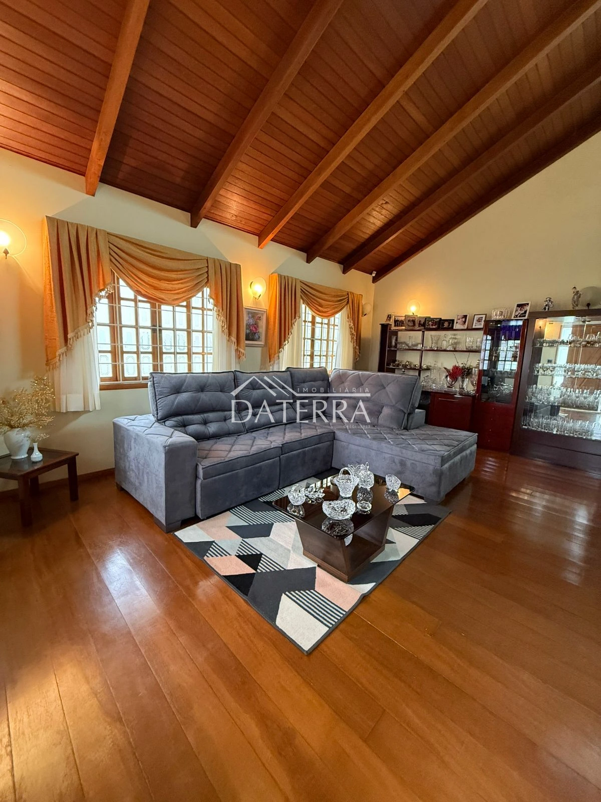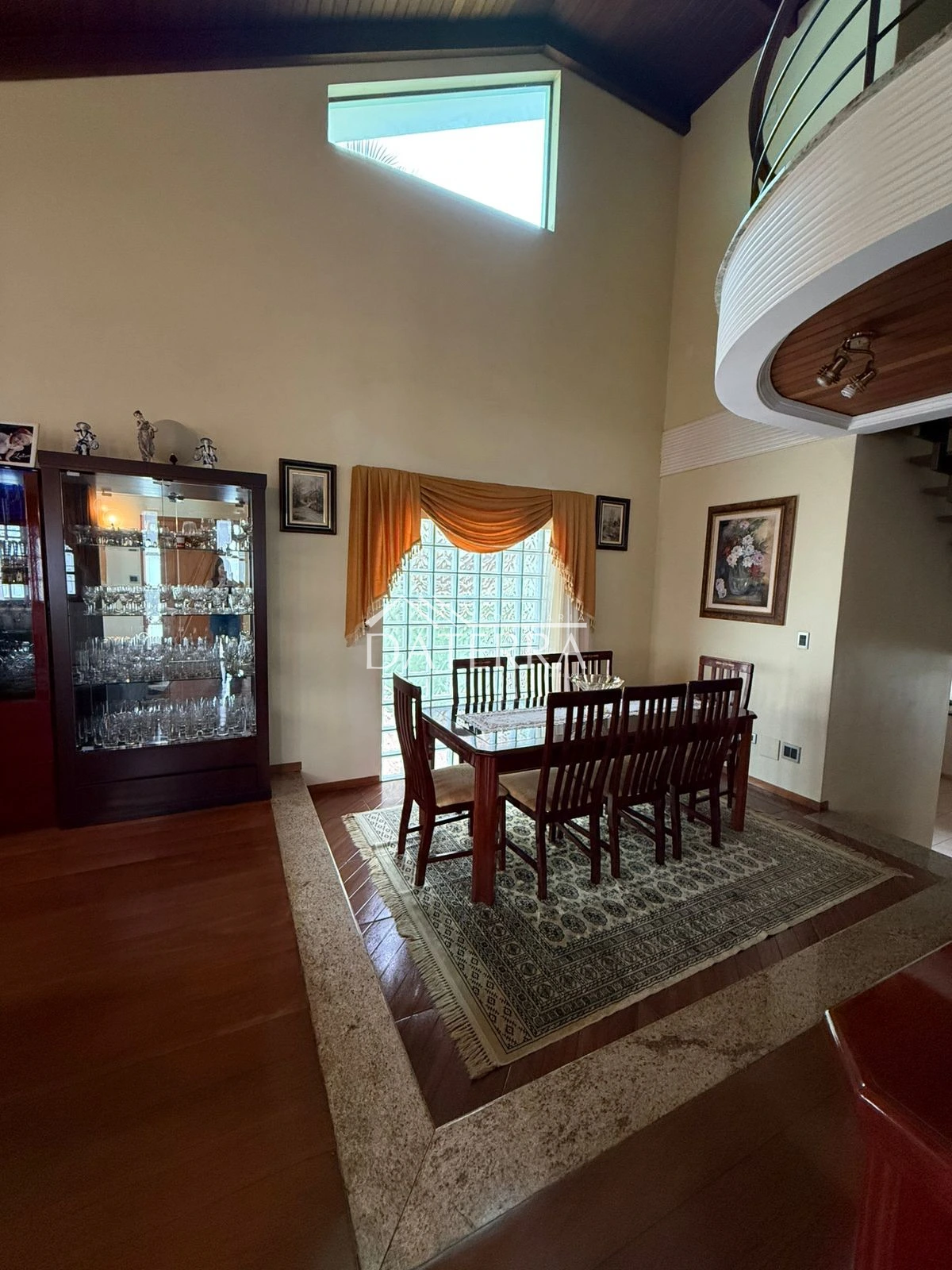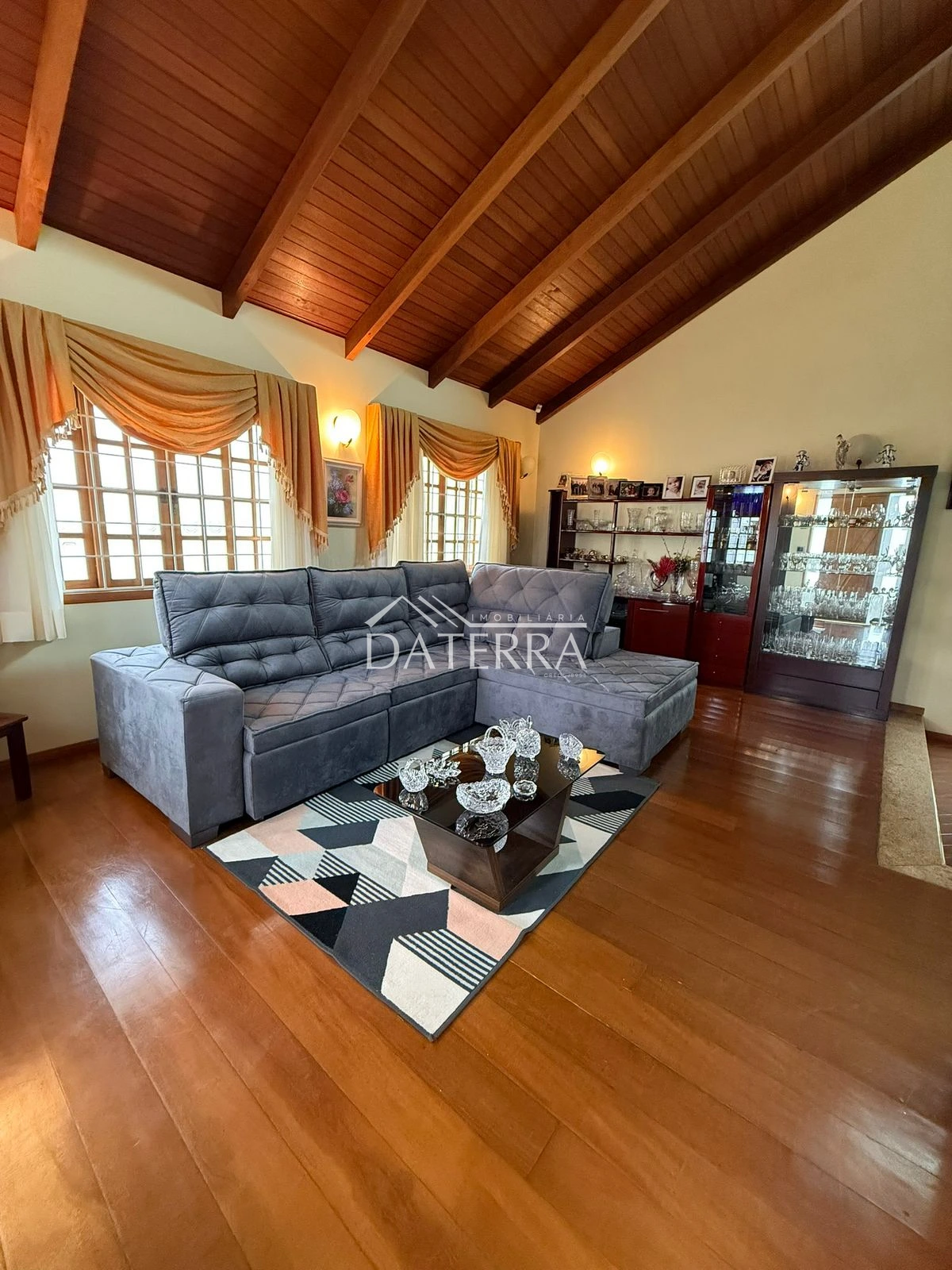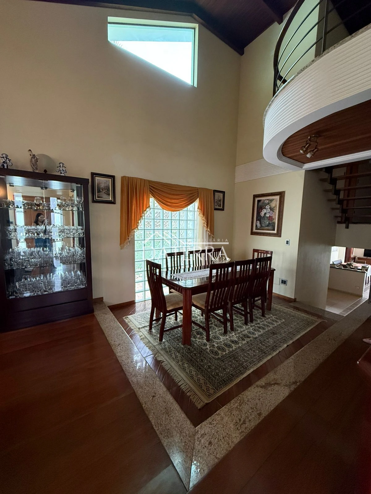 cozinha com churrasqueira ampla, 4 vagas de garagem, lavanderia coberta, área externa com piso e grama, sala de tv íntima do piso inferior, sala com sala de jantar com pe direito duplo em madeira de carvalho