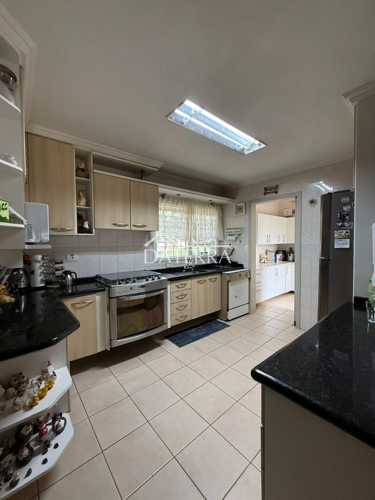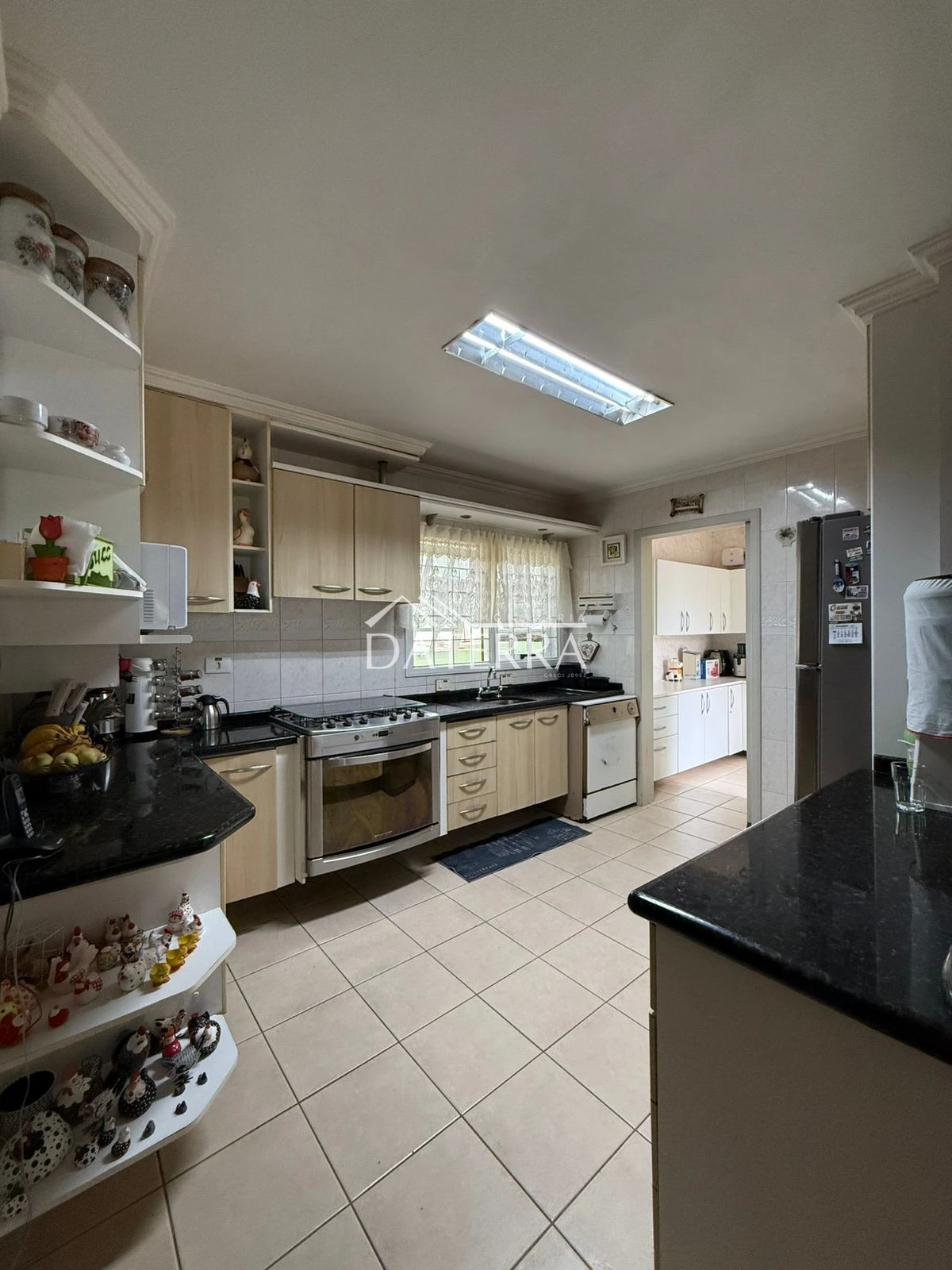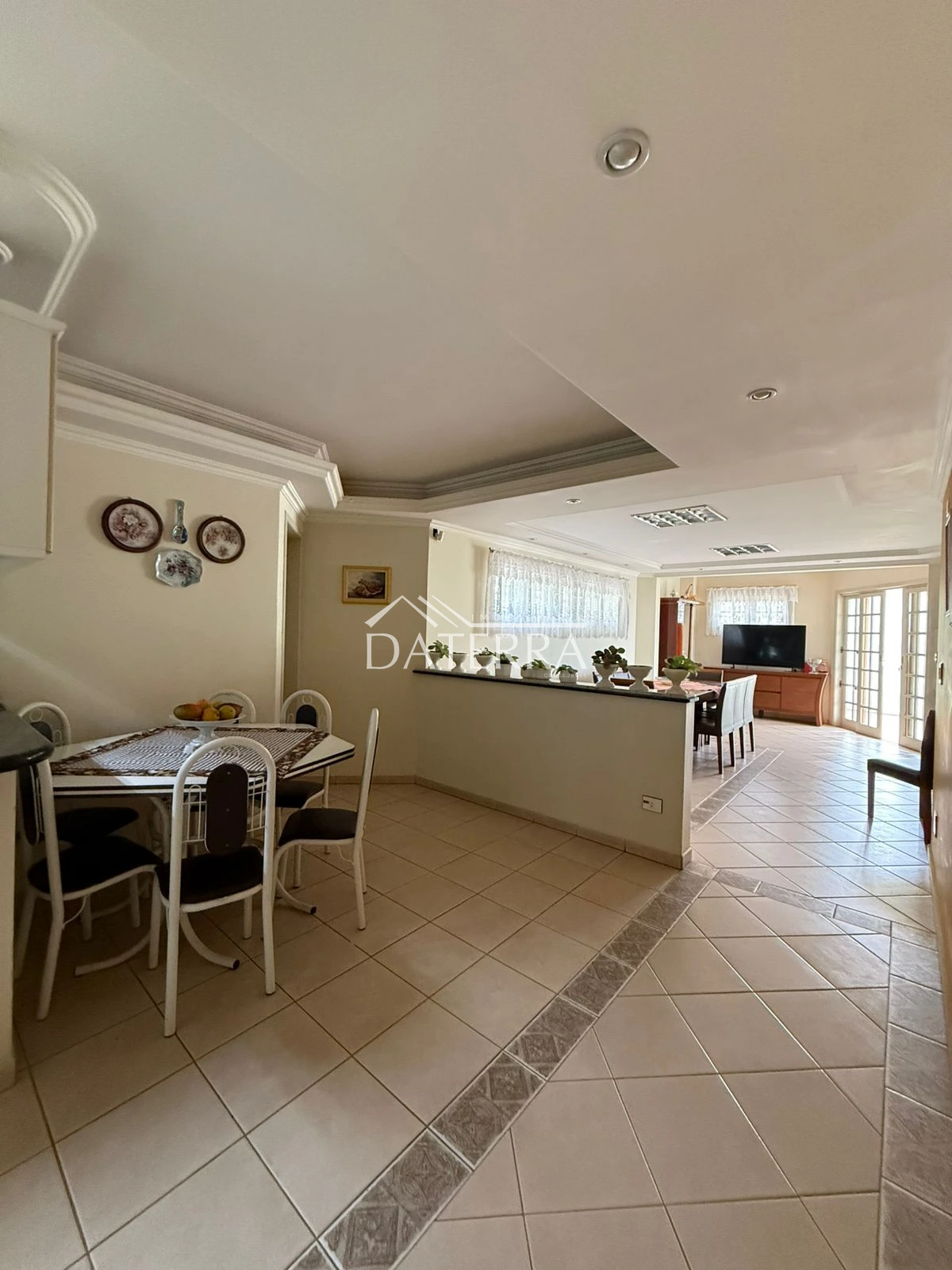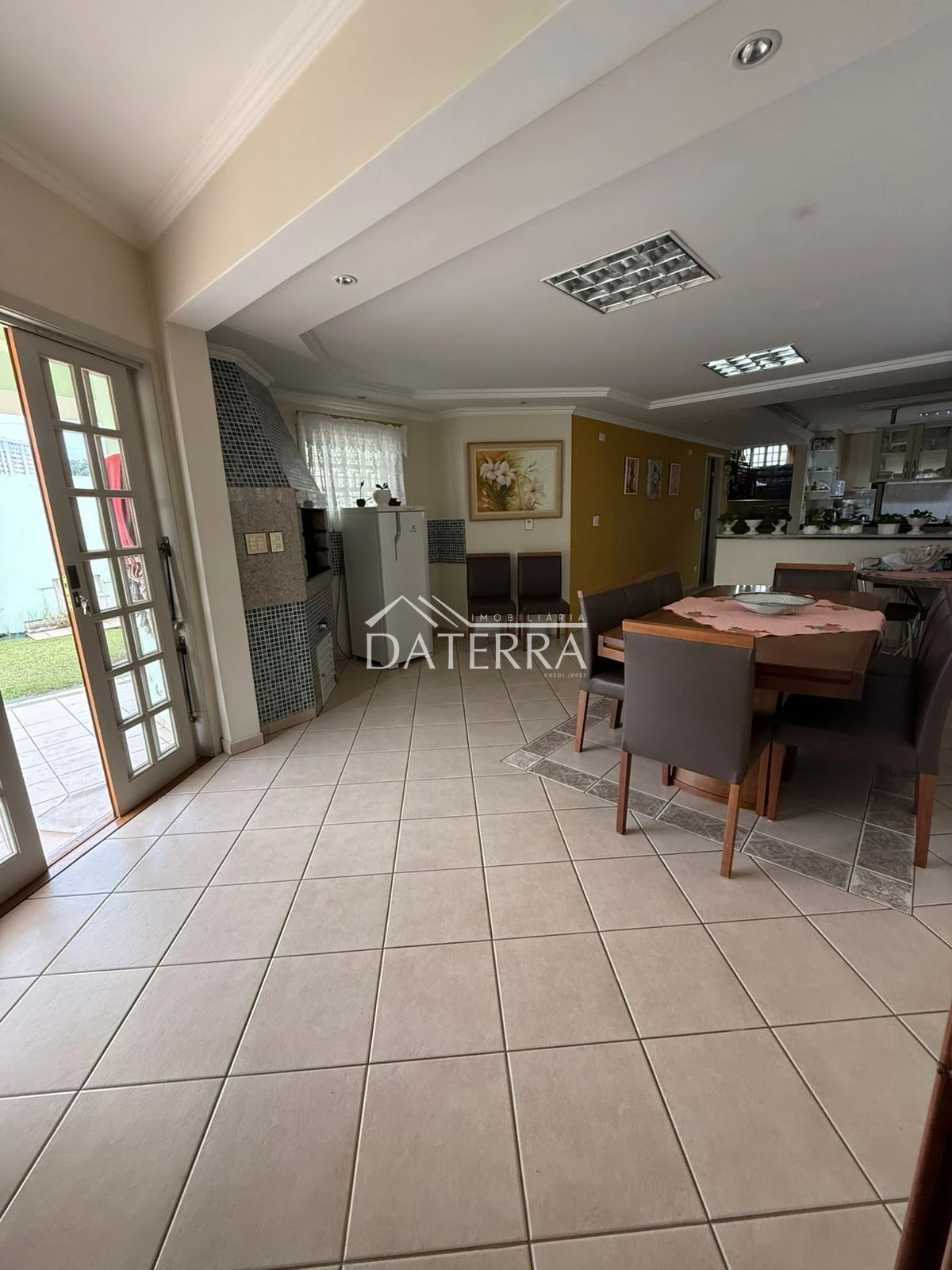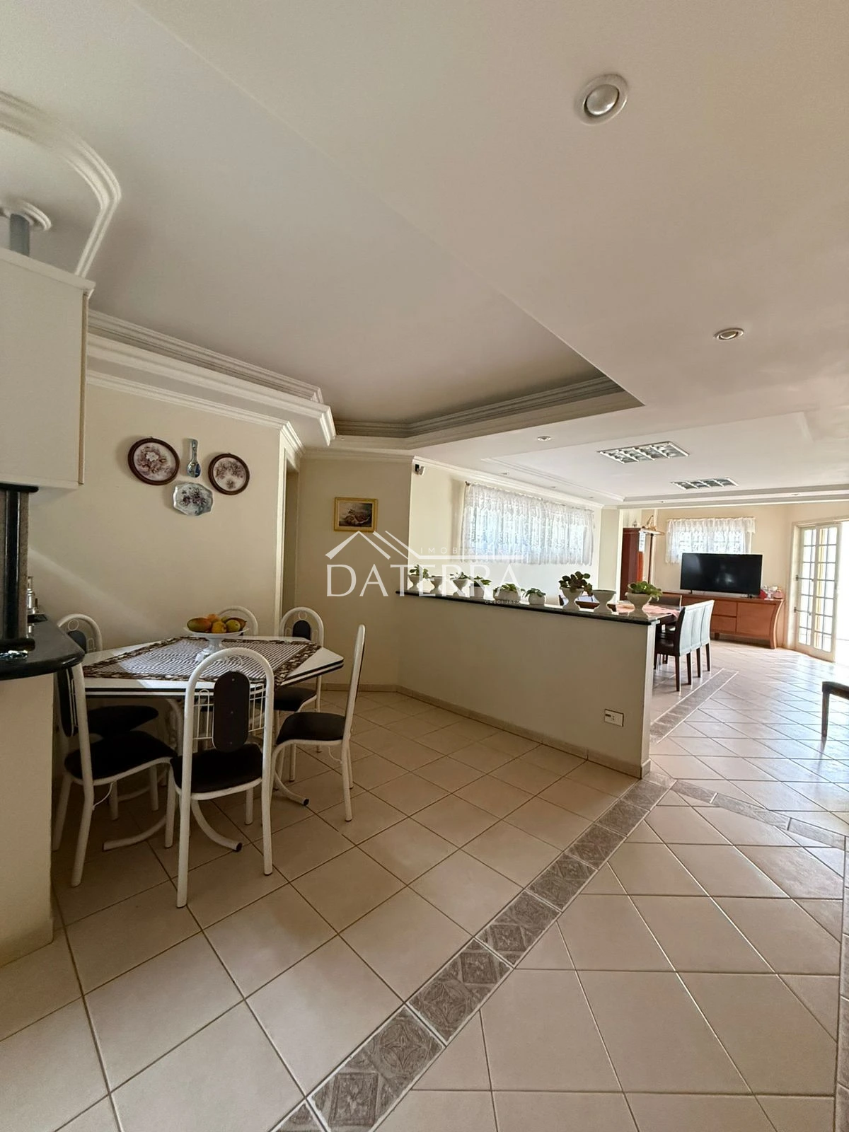 cozinha com churrasqueira ampla, 4 vagas de garagem, lavanderia coberta, área externa com piso e grama, sala de tv íntima do piso inferior, sala com sala de jantar com pe direito duplo em madeira de carvalho